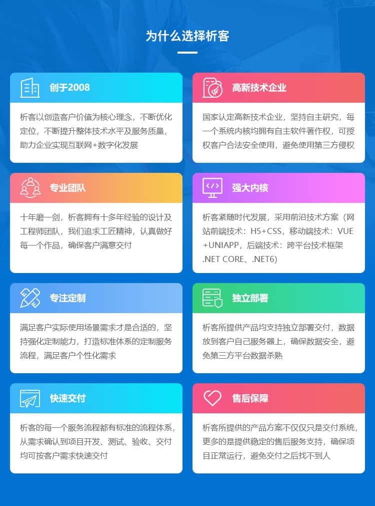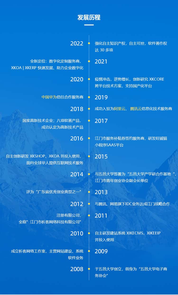 析客网络科技有限公司创立于2008年,是一家信息化高新技术企业,专注解决各类信息化定制需求;旗下自主研发产品包含XKOA(移动办公)、XKSHOP(云商城)、XKCMS(云官网)、XKGOV(云政务)、XK+(行业解决方案)、旺铺猫SAAS商城, 均可结合客户实际需求进行定制开发,已为上万家企事业单位提供信息化技术服务。