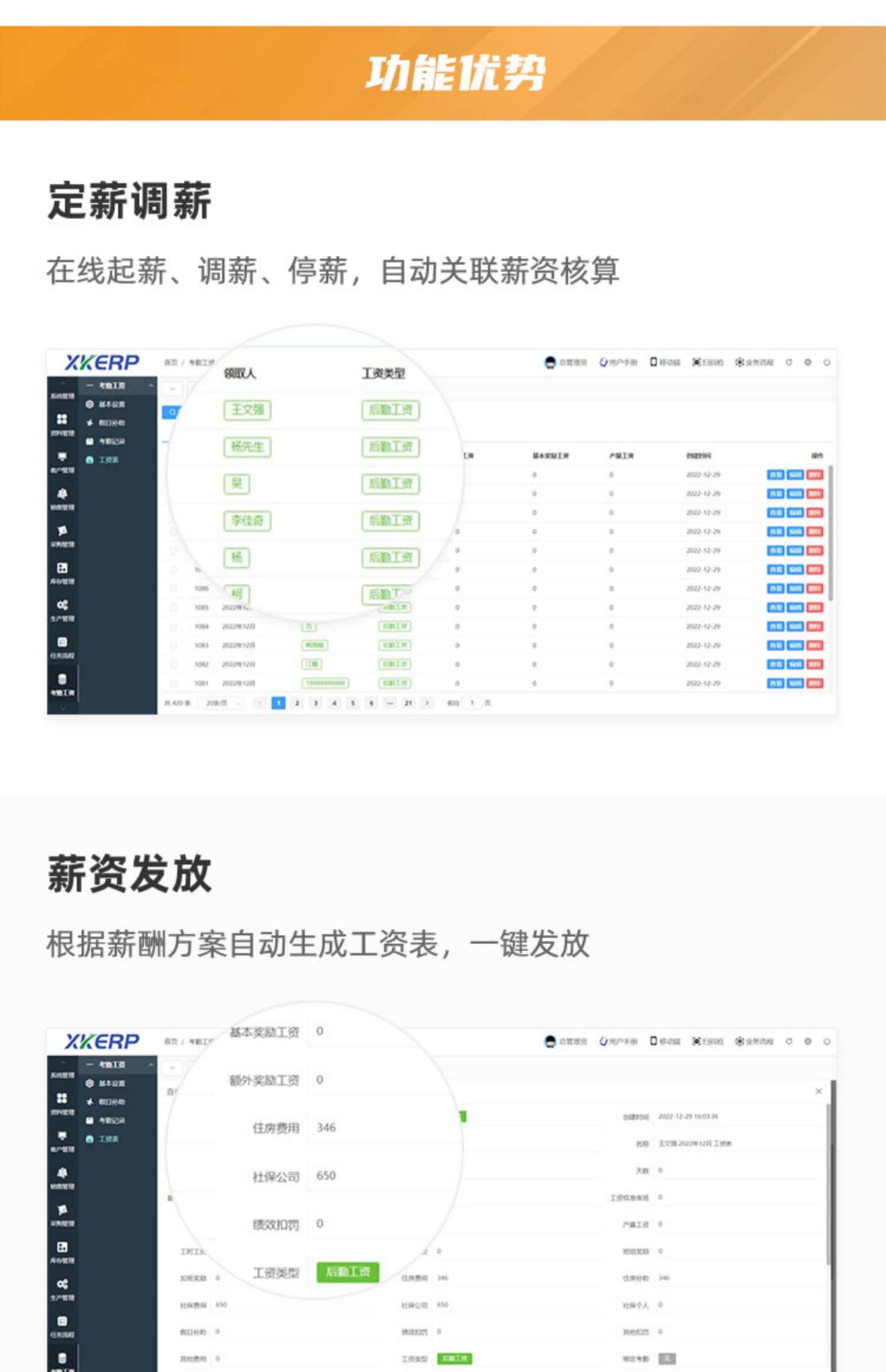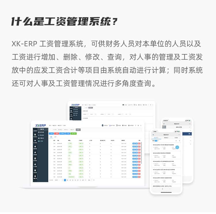 XK-ERP工资管理系统,可供财务人员对本单位的人员以及工资进行增加、删除、修改、查询,对人事的管理及工资发放中的应发工资合计等项目由系统自动进行计算;同时系统还可对人事及工资管理情况进行多角度查询
