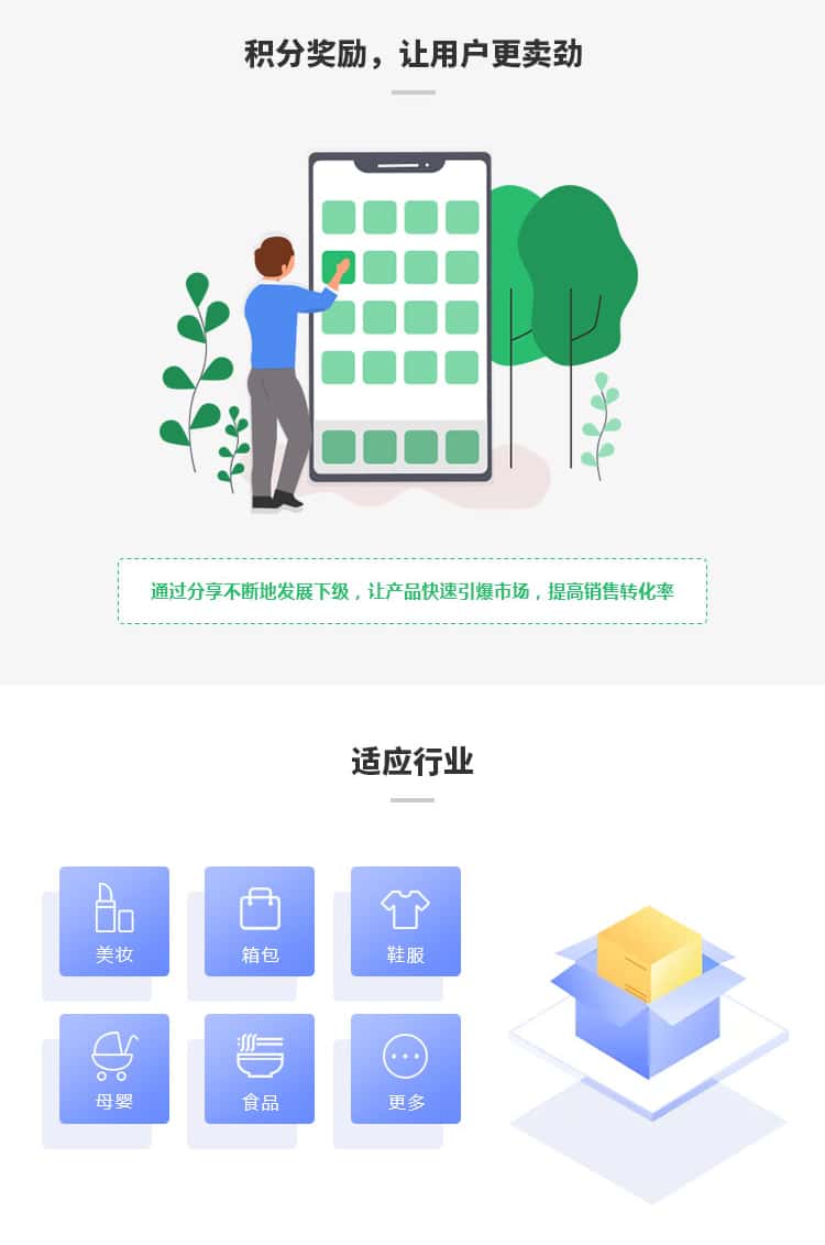 积分商城,致力于为企业提供成熟的会员积分商城系统和积分营销服务,通过每日签到、分享送积分关注送积分、购物送积分等多种积分获取机制,帮助企业解决在客户回馈、会员促销等场景下的积分营销难题,有利于商家稳定用户,同时增加用户的粘性与活跃度,用户生命周期持续延伸,从而让产品快速引爆市场,提高销售转化率。