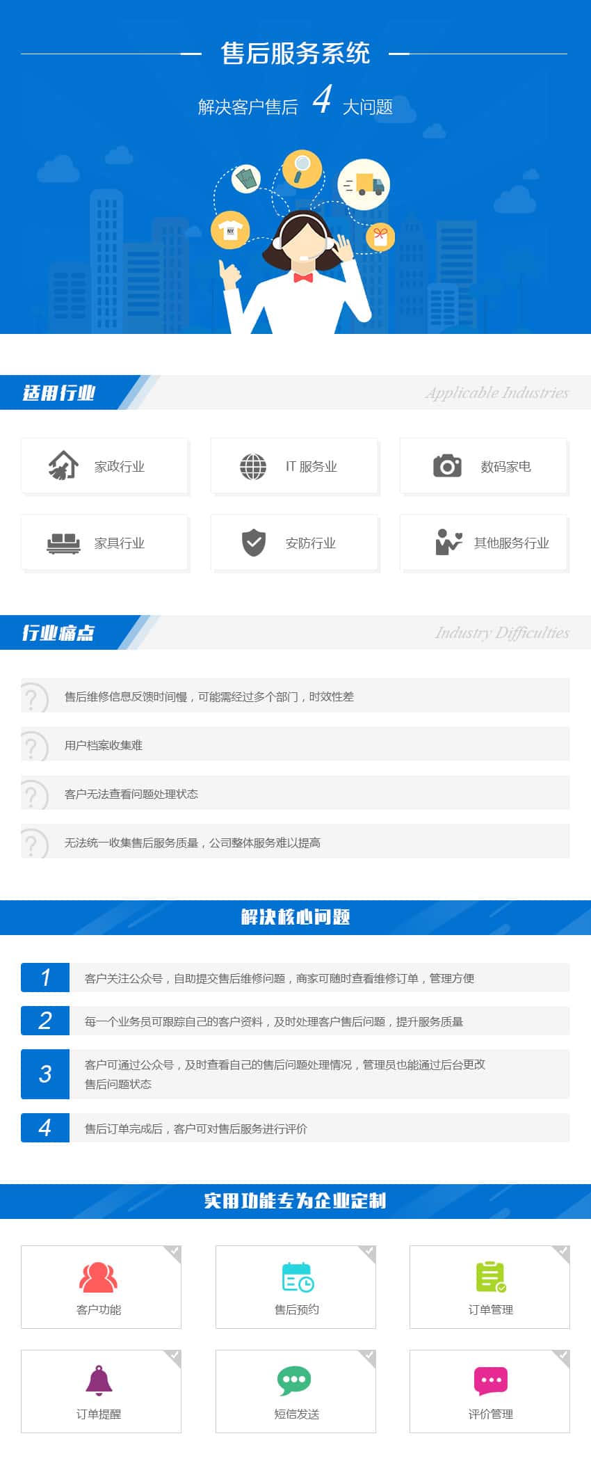 客户功能、售后预约、订单管理、订单提醒、短信发送、评价管理