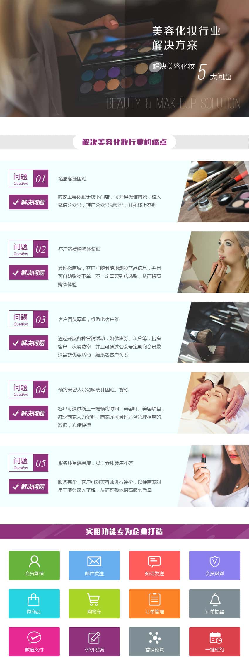 商城系统:增值服务,通过预约和评价系统将客户圈进公众号,公众号商城作为增值产品进行销售,增加创收模式。