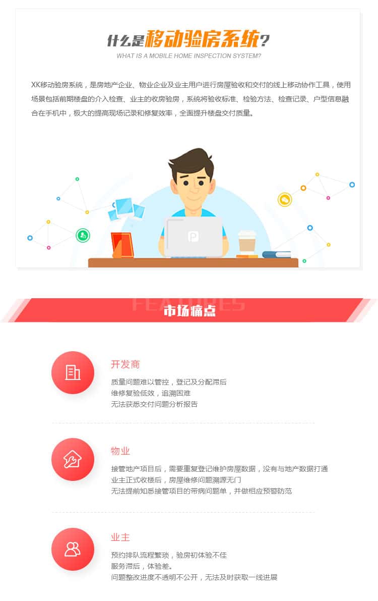 XK移动验房系统,是房地产企业、物业企业及业主用户进行房屋验收和交付的线上移动协作工具,使用场景包括前期楼盘的介入检查、业主的收房验房,系统将验收标准、检验方法、检查记录、户型信息融合在手机中,极大的提高现场记录和修复效率,全面提升楼盘交付质量。