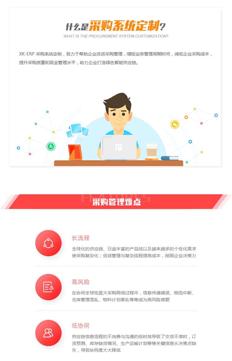 XK-ERP 采购系统定制,致力于帮助企业改进采购管理,缩短业务管理周期时间,减低企业采购成本提升采购质量和现金管理水平,助力企业打造绿色智能供应链。